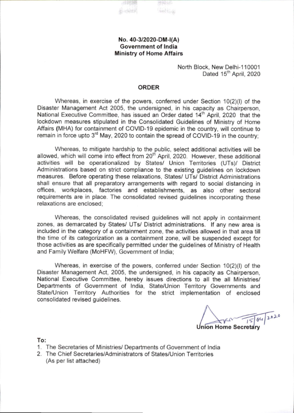 Mha Order Dt 1 5 2020 To Extend Lockdown Period For 2 Weeks W E F 4 5 2020 With New Guidelines Po Tools