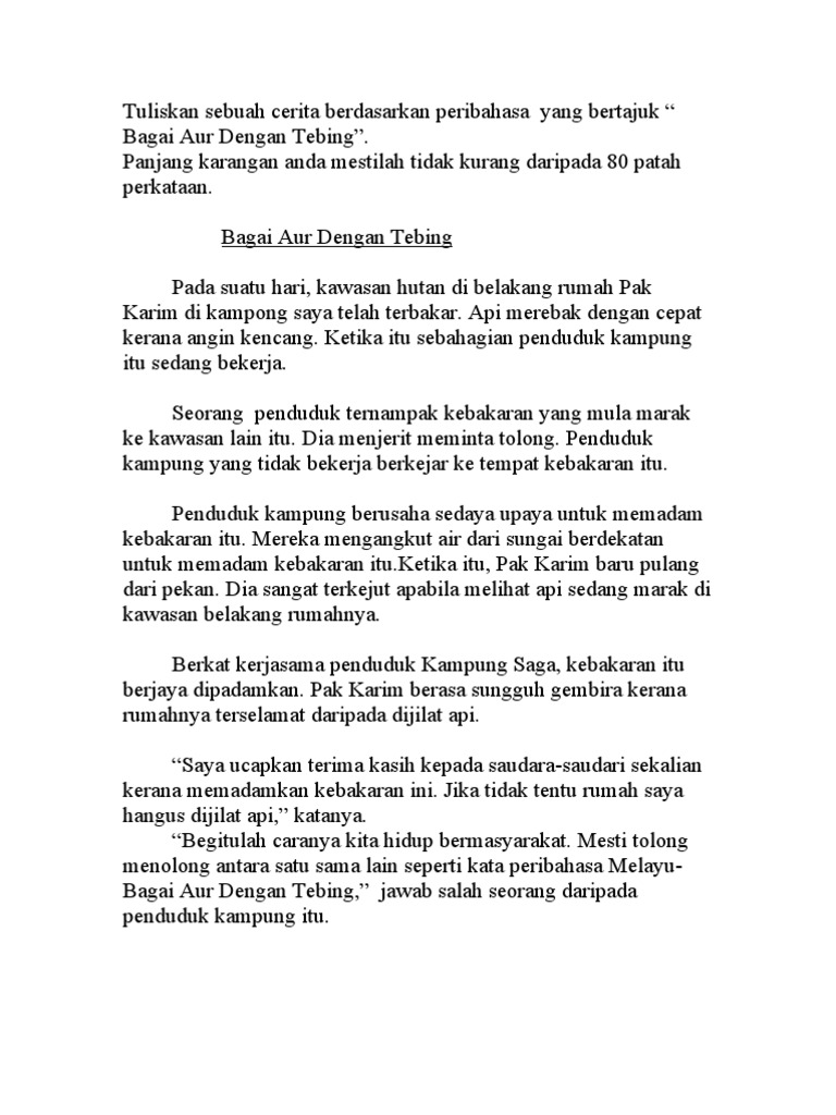 Peribahasa bagai aur dengan tebing dan contoh ayat. Bagai anjing tersepit di pagar. Oleh sebab peribahasa dibentuk dengan satu ikatan bahasa yang indah dan padat maka melekatlah peribahasa itu di mulut orang ramai turun temurun peribahasa digunakan orang sebagai kiasan teladan dan pengajaran. Kata kata tersebut berisi falsafah atau pengajaran yang berguna sebagai panduan hidup. Harus diteladani terutama oleh masyarakat di bandar serta generasi muda.
