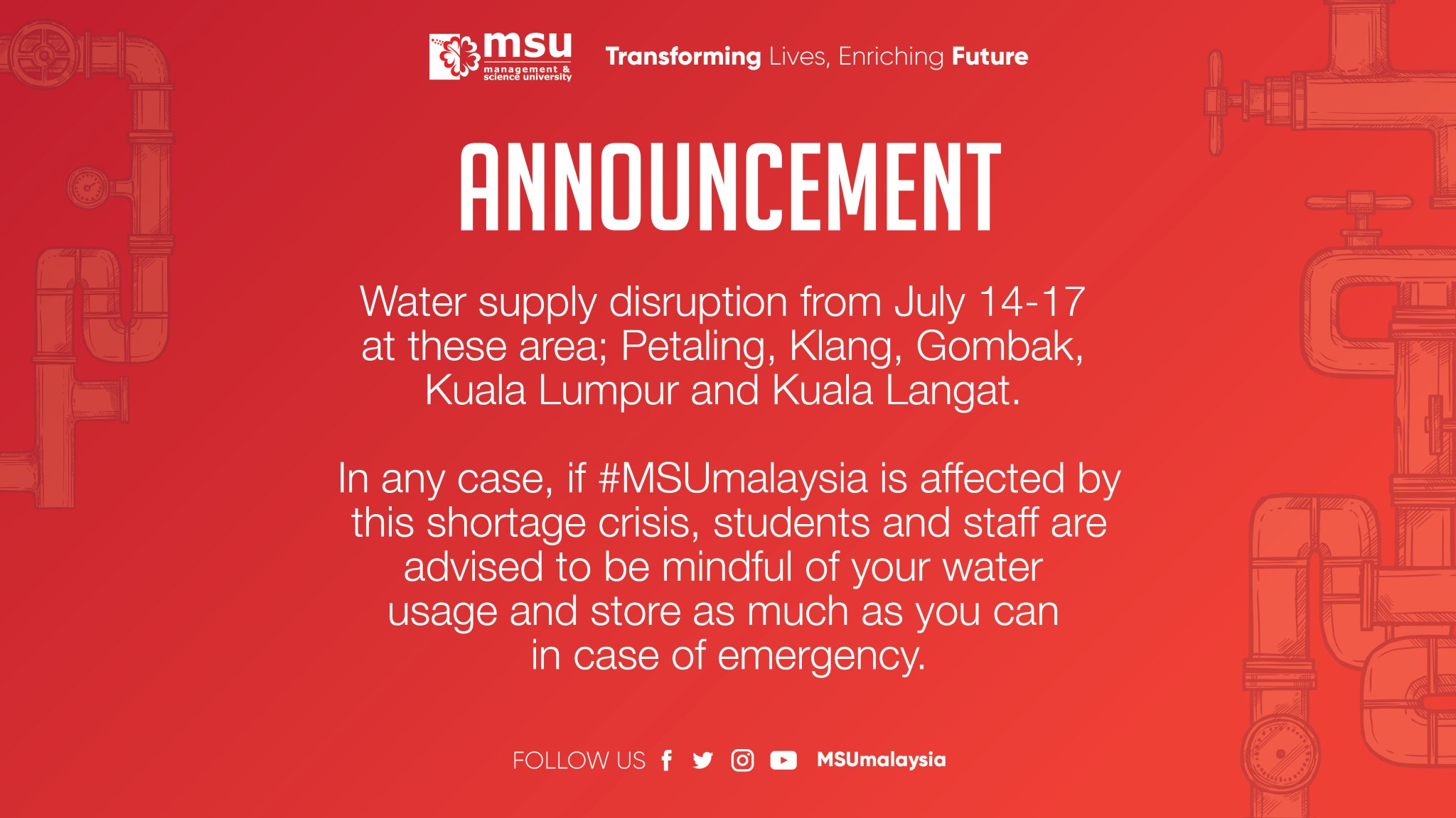 Msu Malaysia On Twitter Announcement In Preparation For The Water Supply Disruption Starting Tomorrow Until July 17th Follow And Refer Air Selangor For The Latest Updates Msumalaysia Https T Co Qt94gvzbet